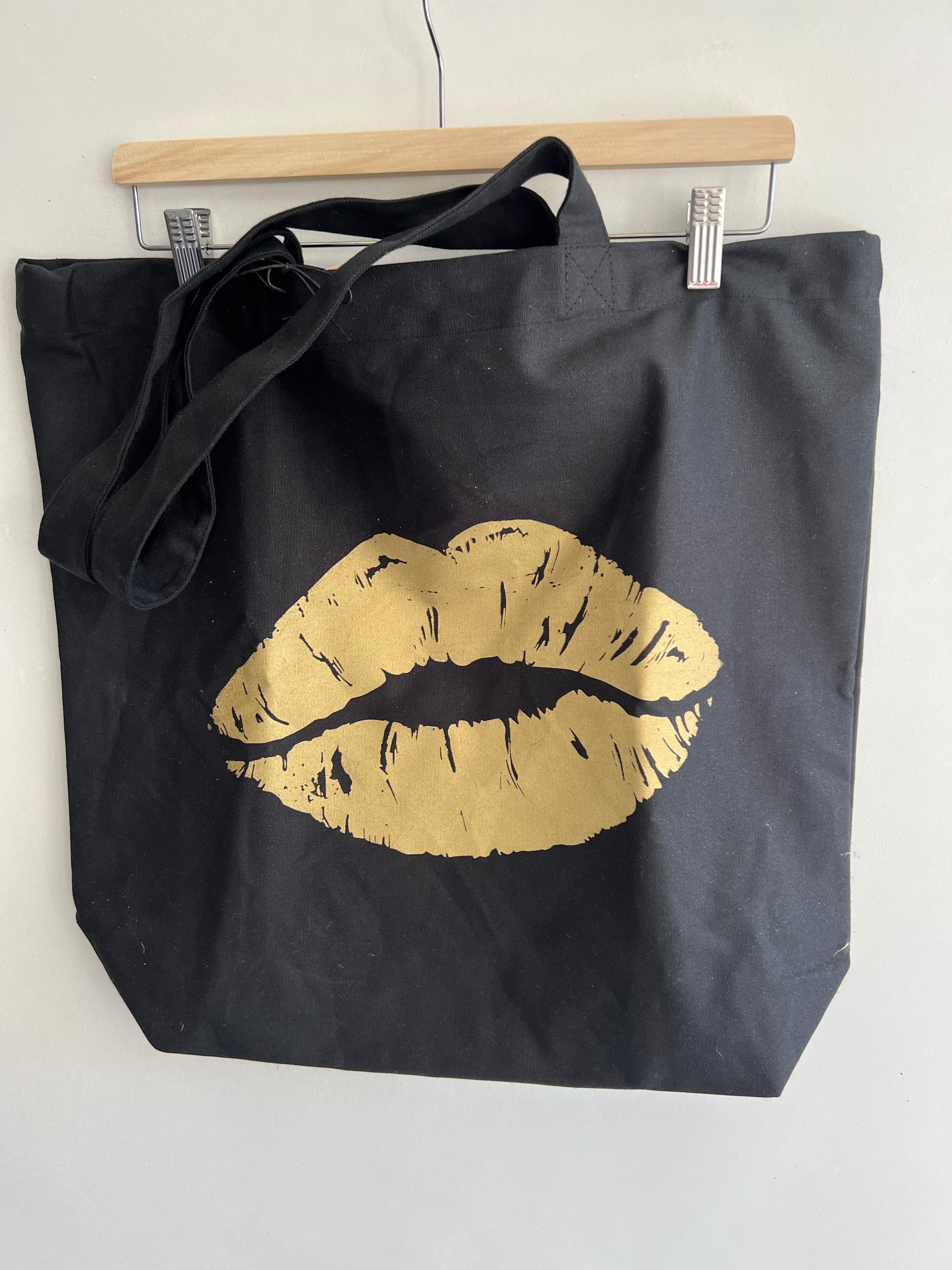 Diese besondere große Tasche in schwarz mit goldenem Kussmund-Aufdruck ist perfekt für Alle, die gern Glitzie tragen und für die ein "Zuviel an Lippenstift" genau richtig ist. Sei du selbst, denn so bist du genau richtig.