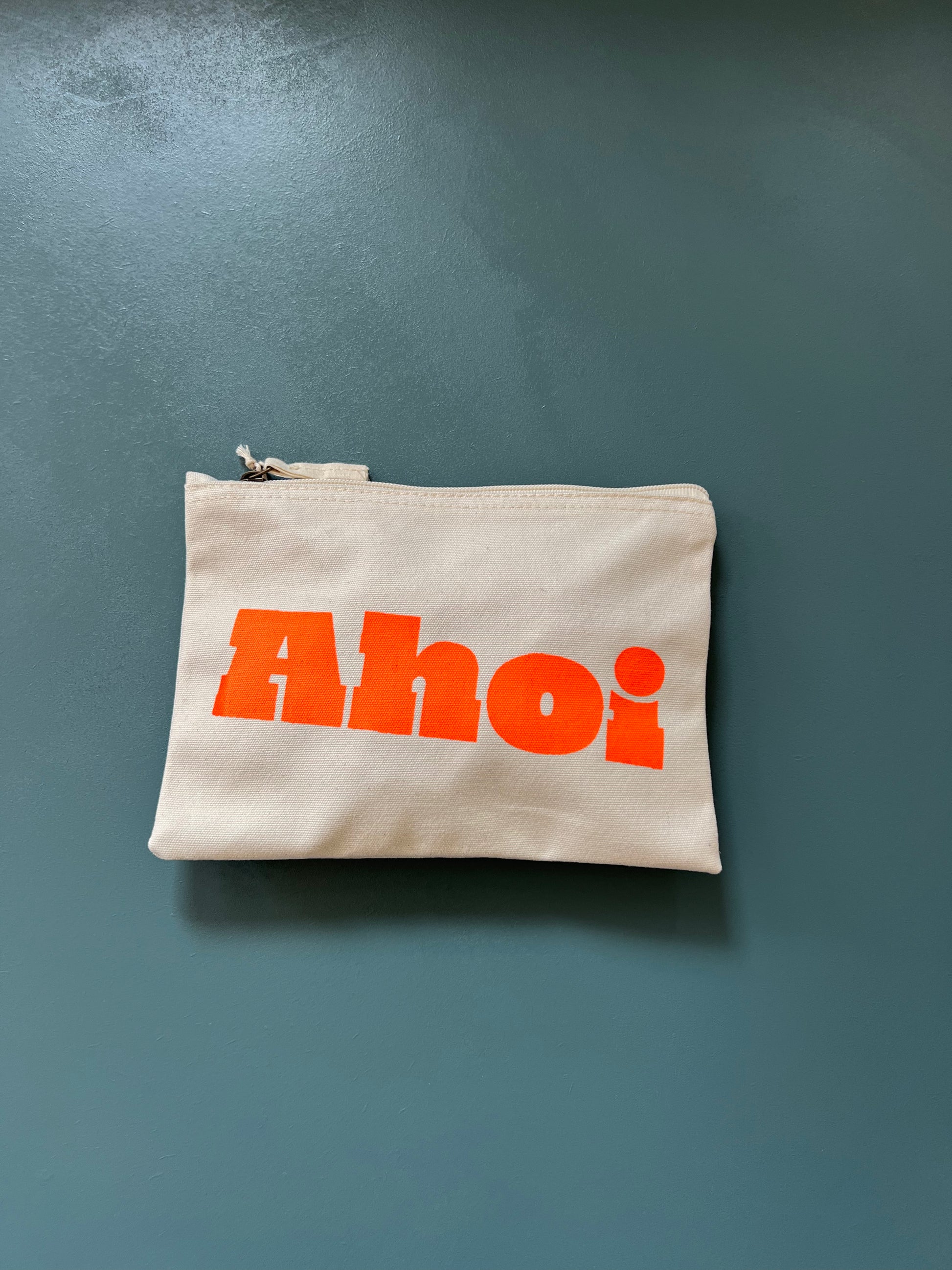 In diesem naturfarbenen Utensilo mit "Ahoi" in Neonorange bedruckt sind deine Kosmetik oder deine Wertsachen am Strand sicher aufbewahrt. Hergestellt aus 100% gebürsteter Bio-Baumwoll-Canvas in neonorange von mir bedruckt.
