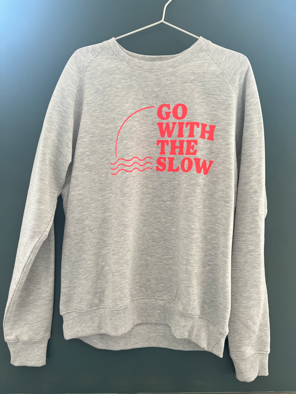 Dieser schöne Sweater in ash grey aus 100% Biobaumwolle von Neutral® Clothing wurde von Manufaktur Noord in Hamburg per Hand im Siebdruckverfahren mit neonroter Farbe bedruckt. (Foto: XL)