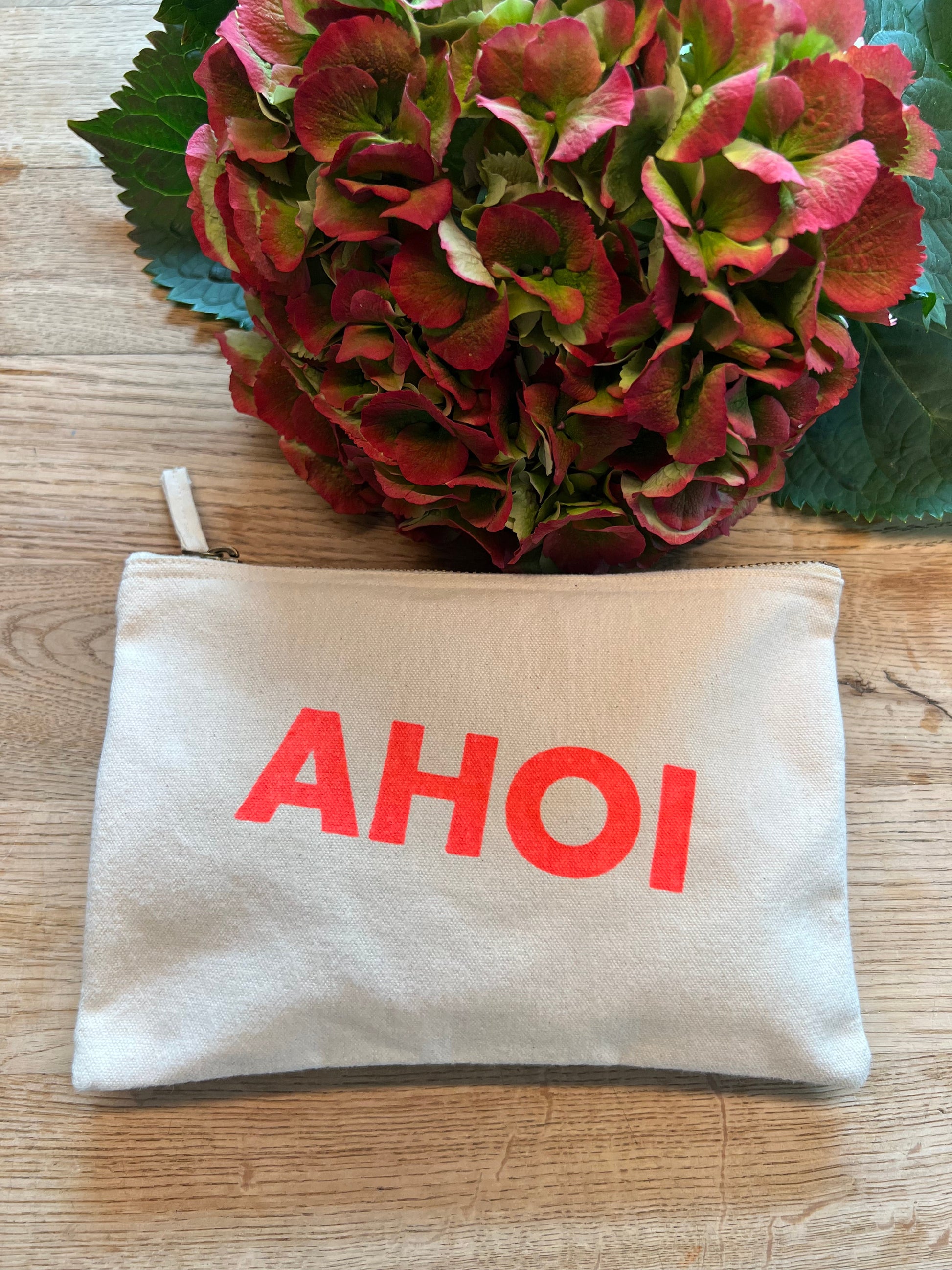 In diesem naturfarbenen Utensilo mit "Ahoi" in neonrot bedruckt sind deine Kosmetik oder deine Wertsachen am Strand sicher aufbewahrt. Hergestellt aus 100% gebürsteter Bio-Baumwoll-Canvas in neonrot von mir bedruckt.